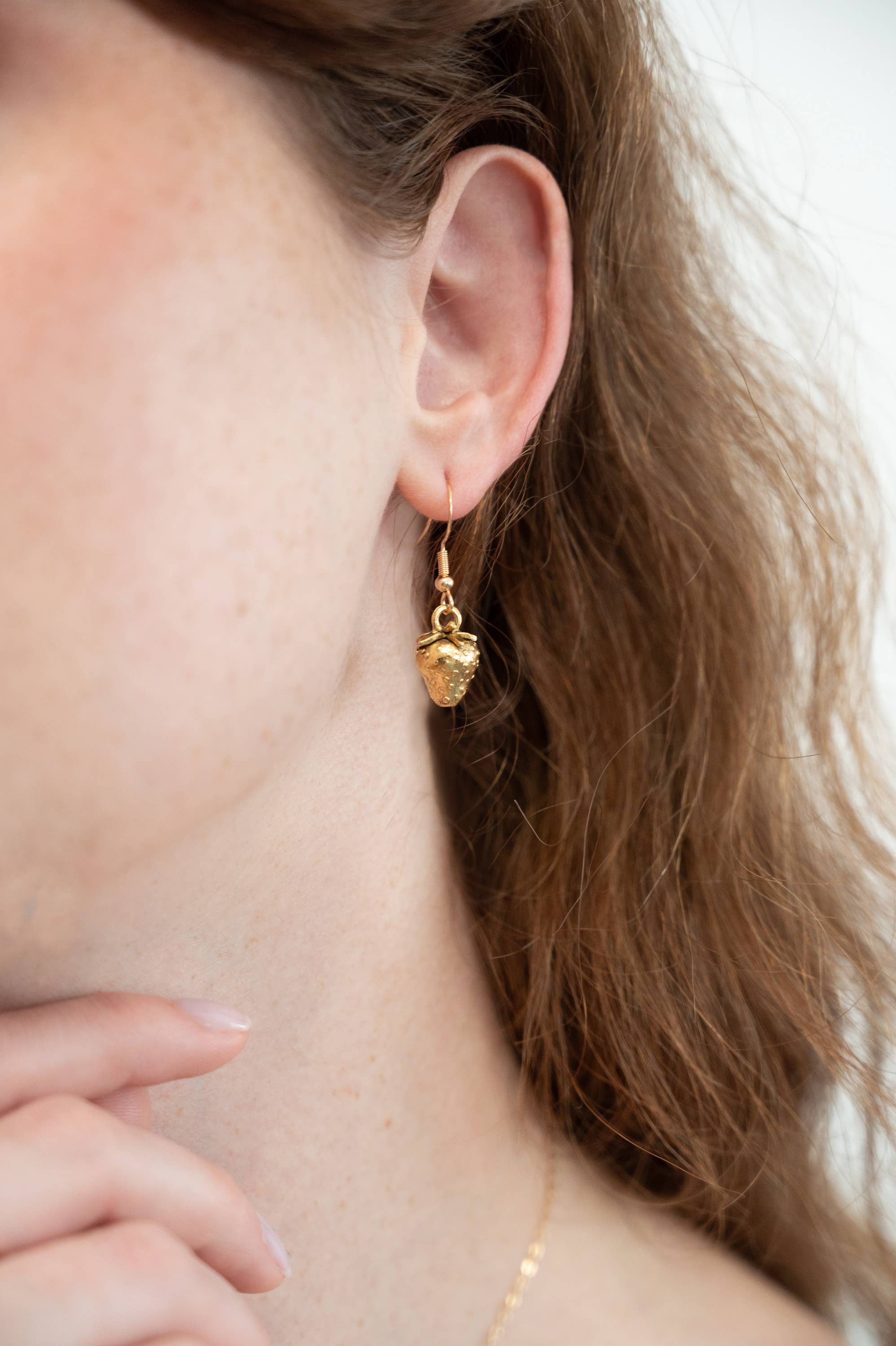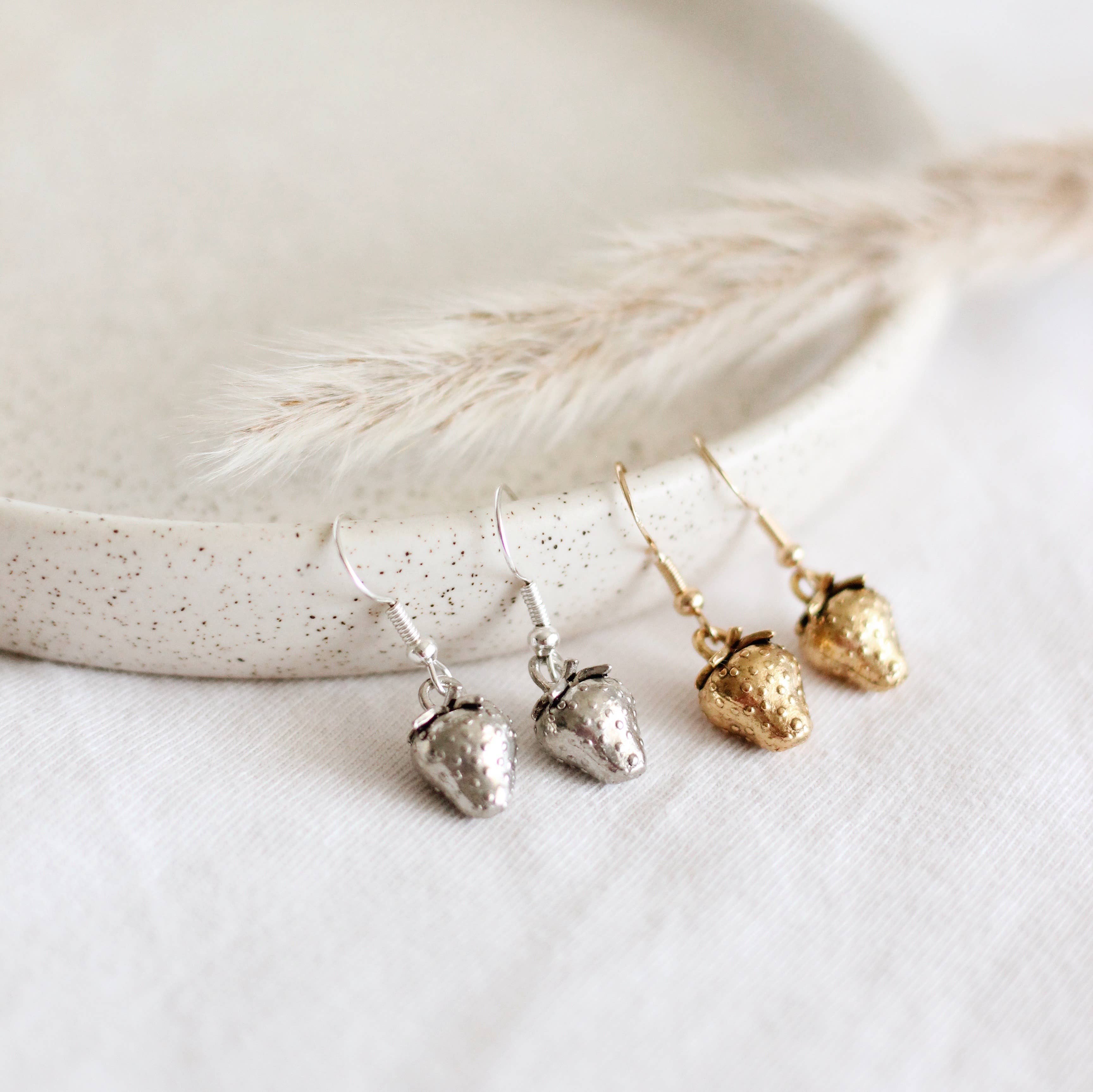 These quirky and playful earrings feature intricately detailed strawberry pendants, adding a touch of fun to any outfit!