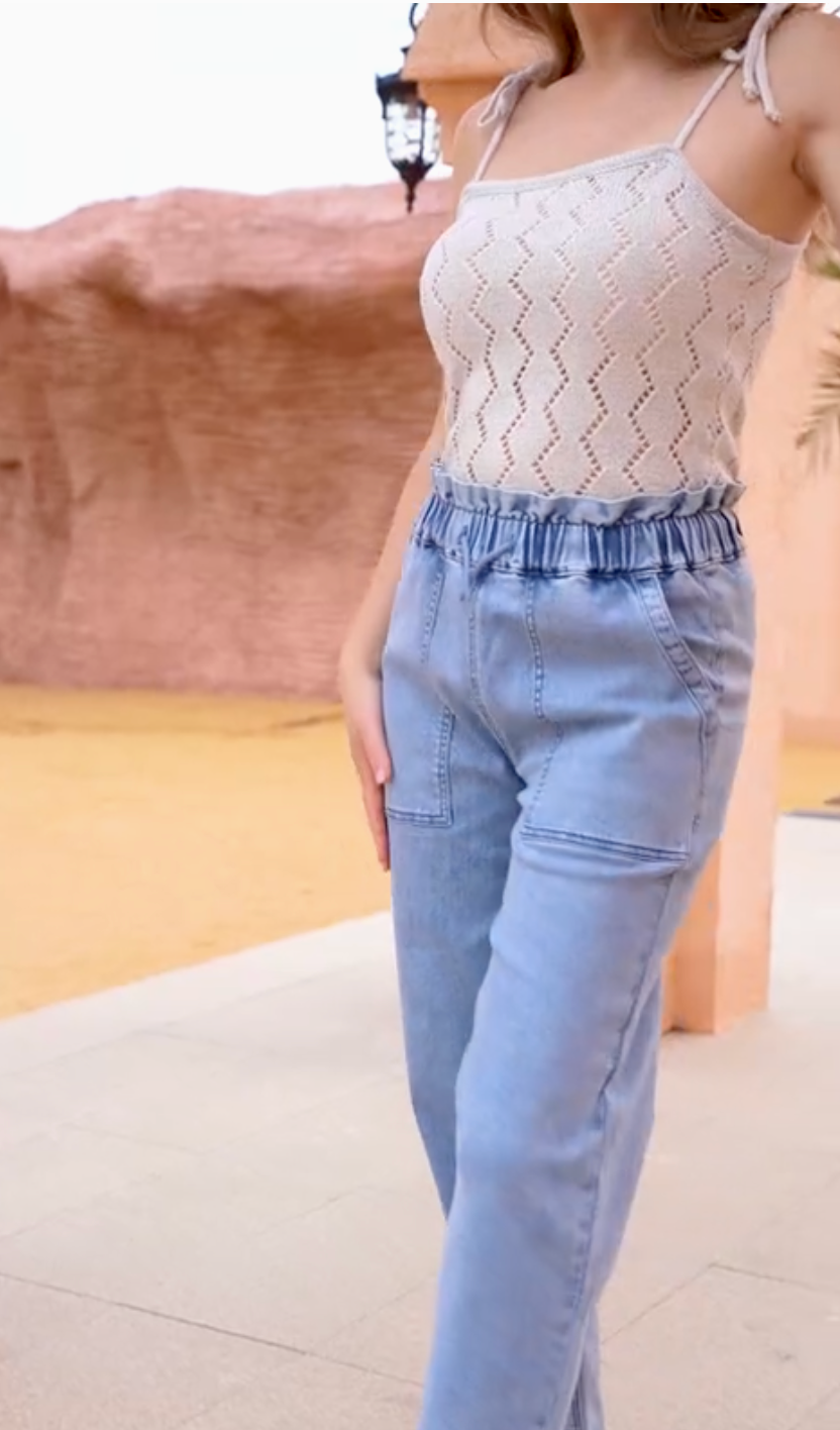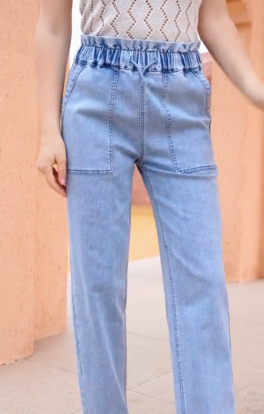 The elastic waistband gives you a relaxed yet flattering fit—no buttons, no zippers, no pinching. Just pull them on and go. Finished with oversized front pockets (because fake pockets are rude), these bamboo denim pants are designed for real life: errands, travel, casual days, and everything in between.