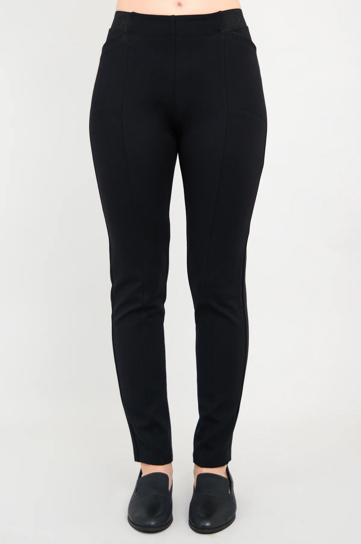 A stretchy waistband ensures all-day comfort, while two hidden front pockets discreetly fit your phone (yes, really). Thoughtful front and back seam detailing enhances the tailored appearance and adds subtle shape to the leg.