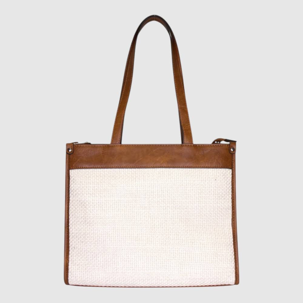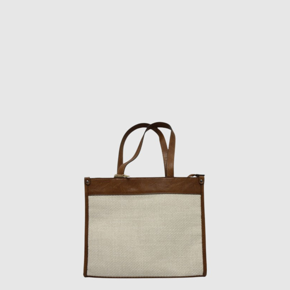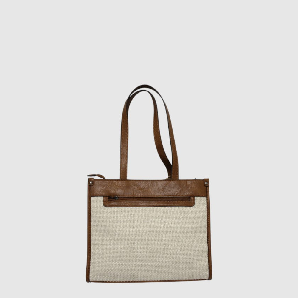 Elevate your everyday carry with the Arya Handbag in Cognac Beige, where classic sophistication meets modern practicality. Crafted from a soft beige tweed fabric framed by rich cognac vegan leather accents, this bag is a stylish statement that pairs beautifully with both workwear and casual outfits.