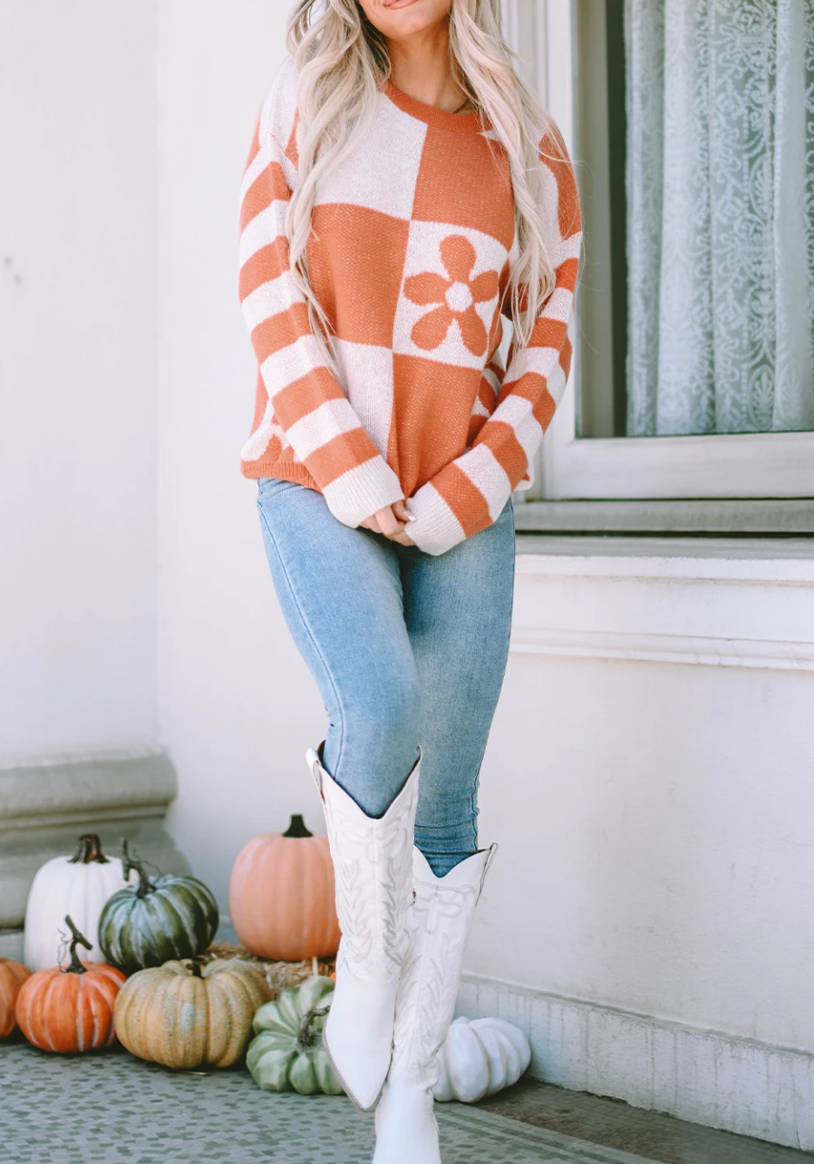 Bold, cozy, and unapologetically fun—the Orange You Glad Sweater is here to brighten your cold-weather lineup. Featuring an orange checkered floral print paired with striped long sleeves, this sweater blends playful pattern with everyday wearability. It’s the kind of piece that does all the talking so the rest of your outfit can relax.