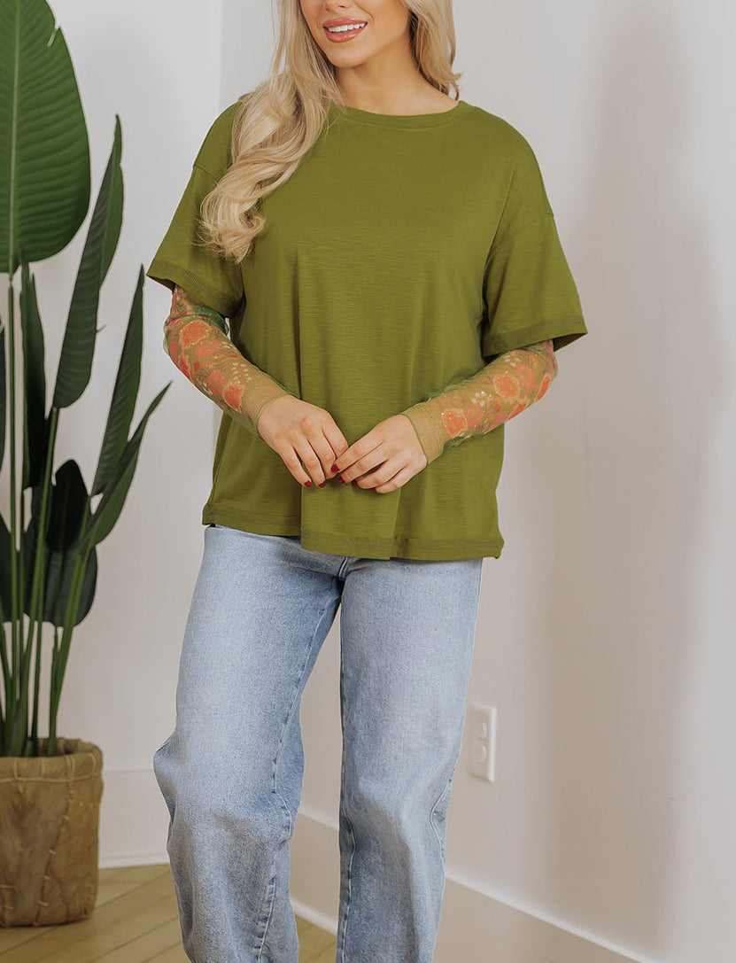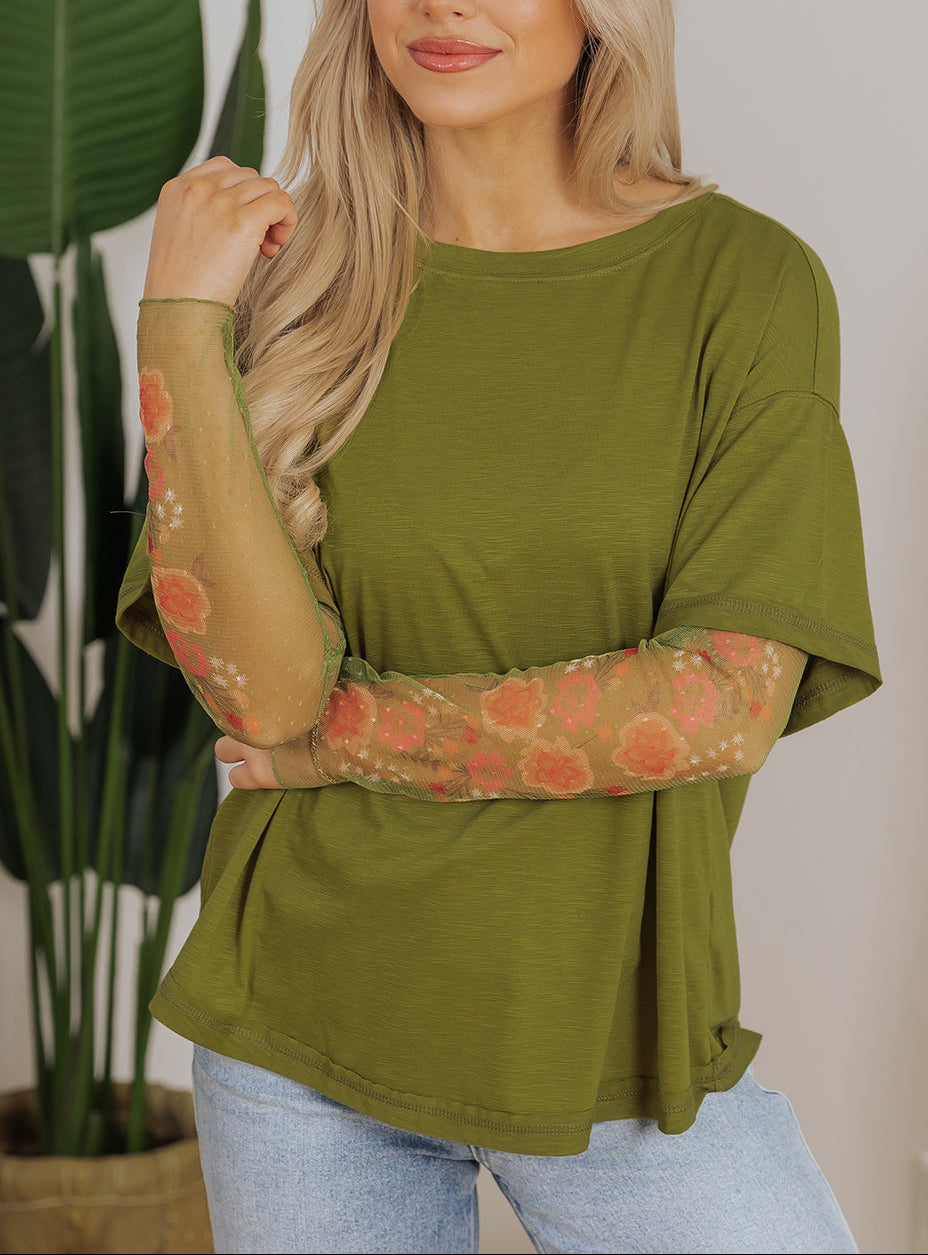 This is not your average tee. The Faux Floral Mesh Tee gives you the layered look without the bulk, featuring delicate floral mesh long sleeves that create a faux 2-piece effect—all in one easy, breathable top. It looks like you thoughtfully styled a mesh underlayer… but really, you just threw it on and went about your day like the style genius you are.