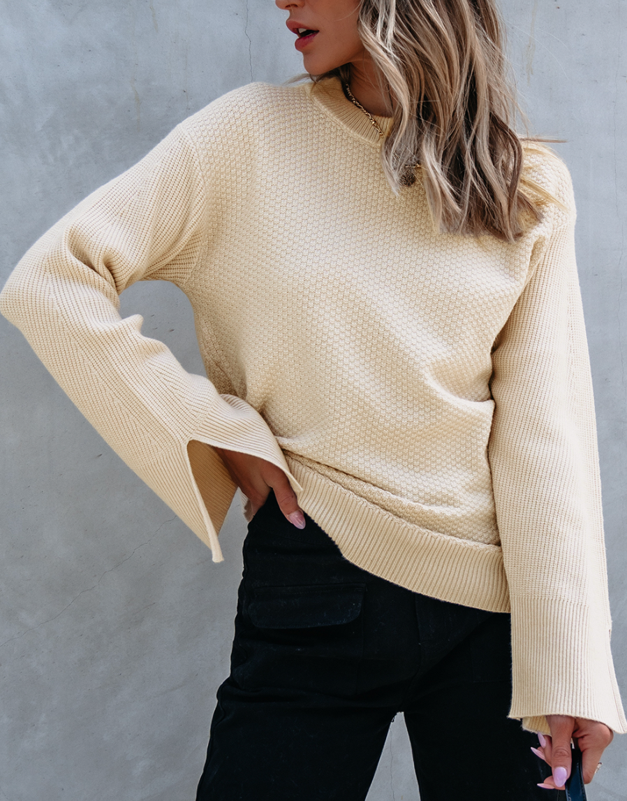 The loose fit and drop shoulder design create a relaxed, laid-back silhouette, while the split cuffs add a subtle touch of flair and elevate this classic sweater beyond basic. Ribbed sleeves contrast beautifully against the waffle-knit body, making it a standout yet versatile piece that pairs with literally anything. From office meetings to weekend brunches or cocktail evenings, this sweater layers effortlessly with necklaces, rings, and your favourite accessories.