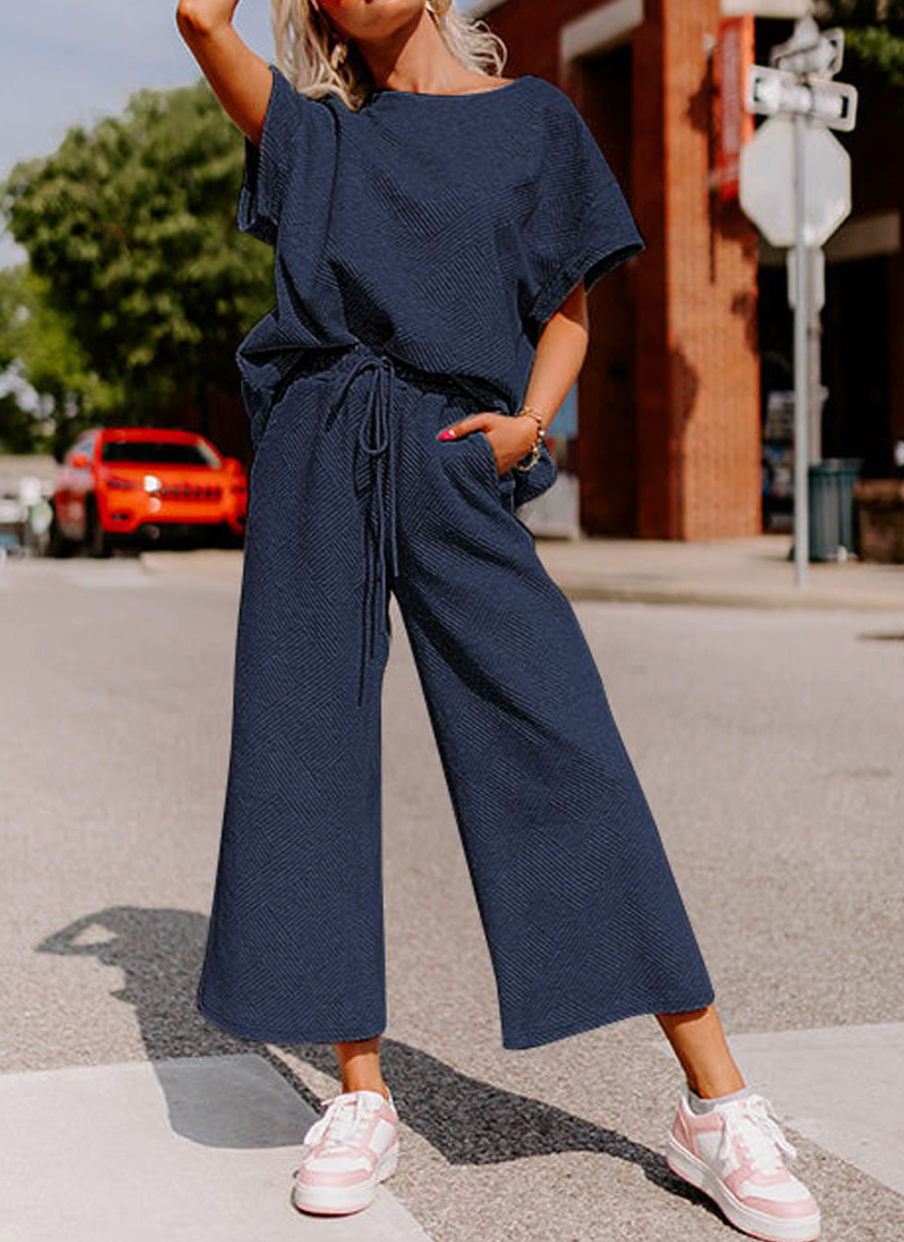Meet the definition of effortless style. The Navy Genesis 2PC Set pairs a classic dark blue textured oversized tee with relaxed wide-leg drawstring pants for a look that’s equal parts polished and comfortable. The loose-fit T-shirt features a subtle crossover herringbone texture that adds depth without trying too hard, while the high-waisted pants deliver stretch, flow, and all-day ease. Slanted pockets and an elastic drawstring waist seal the deal—functional, flattering, and zero fuss.