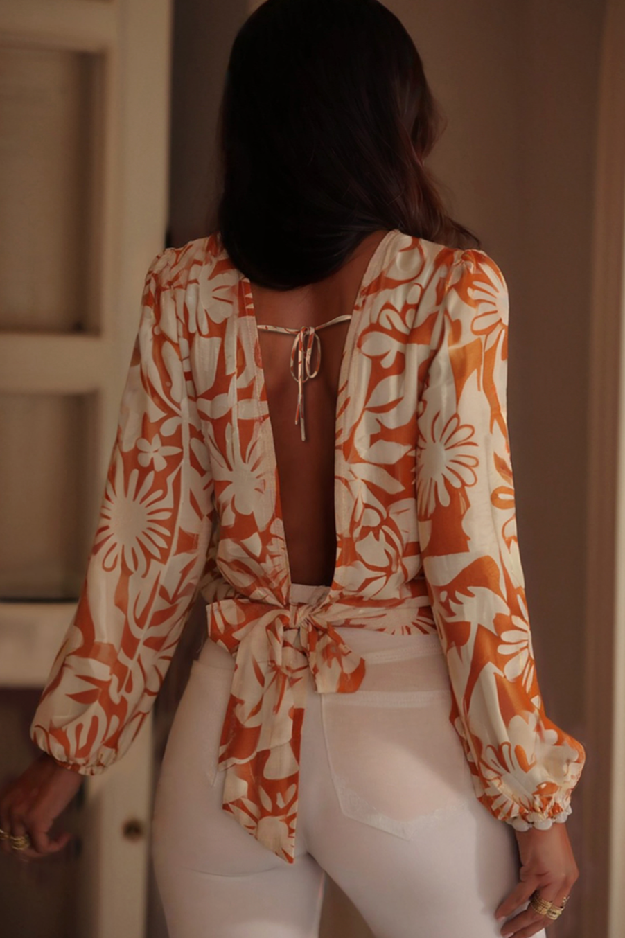 The self-tie back closure not only adds a romantic touch but also offers a flexible, adjustable fit tailored to your waistline. Perfect for pairing with tailored trousers for work or a flowing skirt for an evening out, this backless floral blouse transitions seamlessly from day to night.