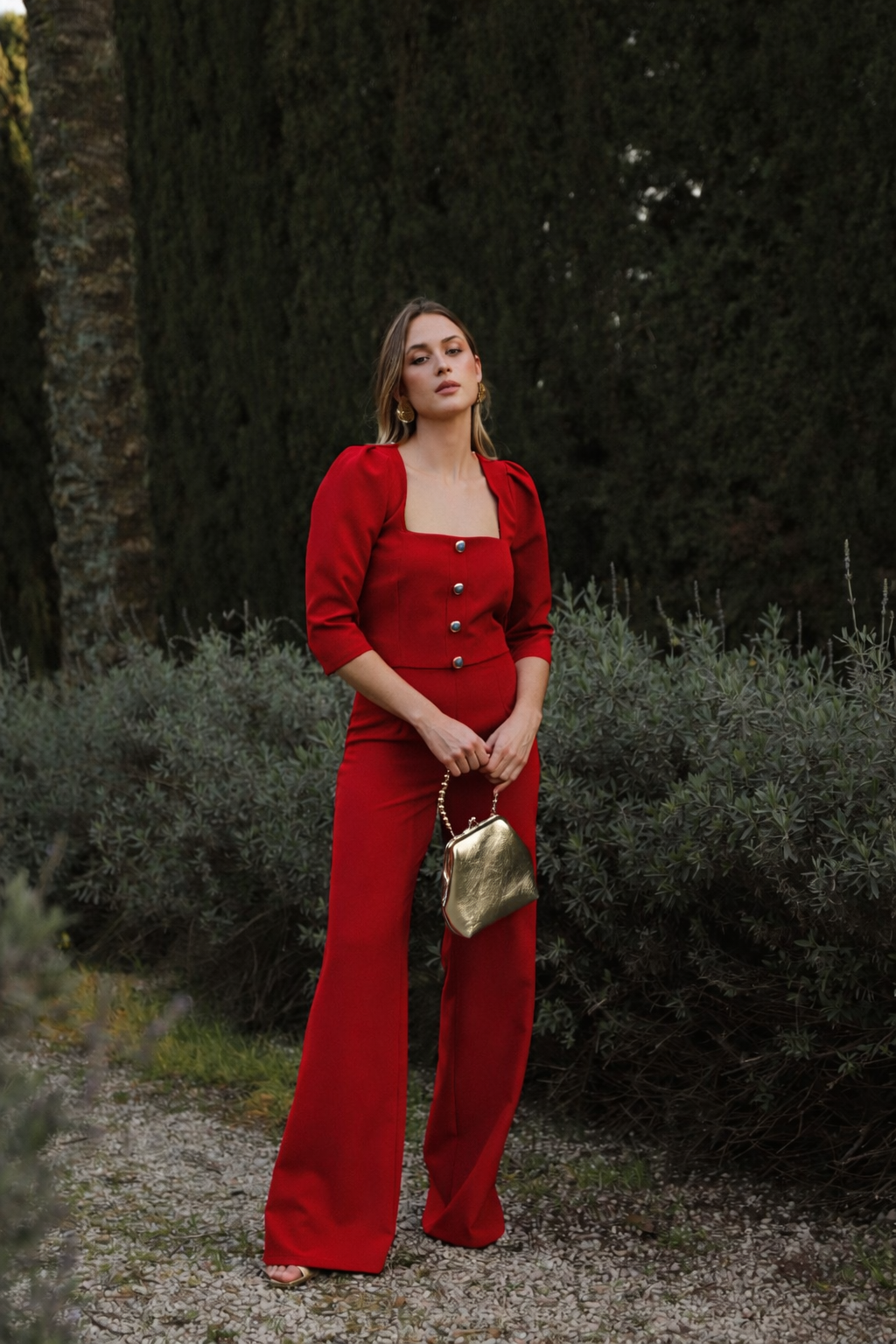 The coordinating pants are tailored with a straight-leg cut and a sleek side zipper closure, creating a long, streamlined shape that balances perfectly with the bold top. Crafted from bioelastic fabric, this red statement outfit is crafted from quality sustainable materials — so you can dance, celebrate, and move comfortably all night long.