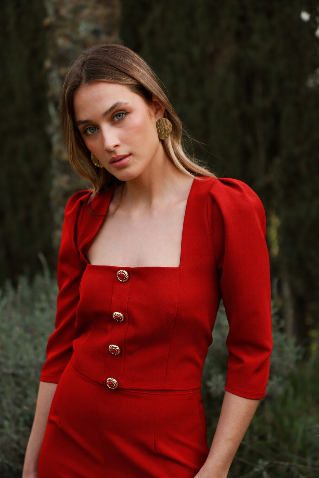The ruby red blouse features a deep square neckline, softly gathered shoulders, and flattering 3/4 length sleeves for a romantic yet structured silhouette. Finished with jewel-style buttons, inner lining, and an invisible back zipper, the top feels as luxurious as it looks.