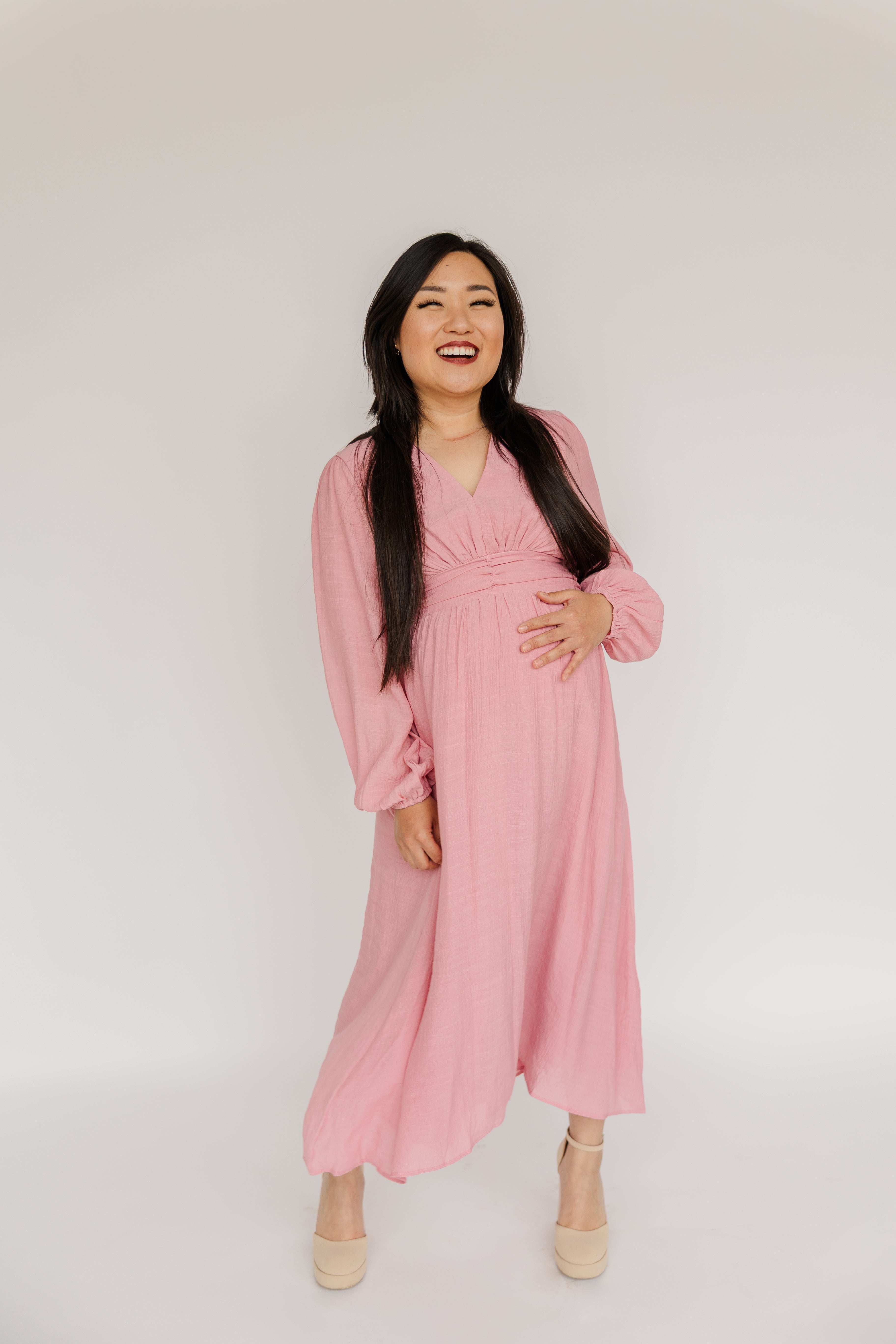 Crafted in a soft pink hue that captures the warmth of golden hour and the sweetness of prairie blooms, this midi-length dress features flowing balloon sleeves, a v-neckline that elongates the torso, and a gently elasticized waist for a flattering fit. It’s fully lined, bump-friendly, and petite-approved — perfect for brunch dates, garden parties, and spontaneous road trips alike.
