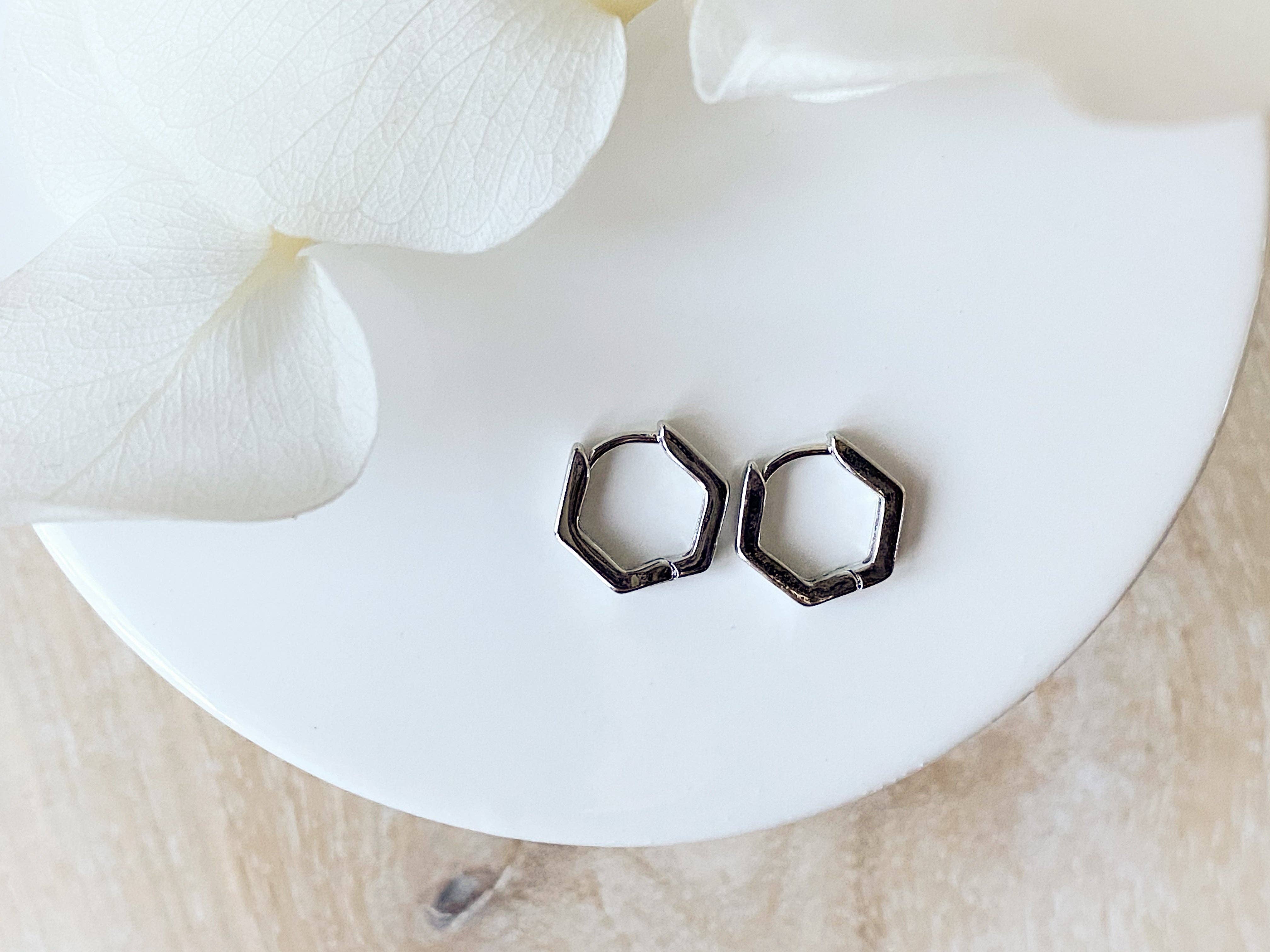 Elegant and minimalist, these Platinum-Plated Hexagon Huggie Earrings offer a refined polish to any outfit. Small and geometric, they provide a subtle yet sophisticated statement, perfect for everyday wear or layering. Crafted with care, they are nickel-free and designed to be comfortable for all-day wear, making them an ideal choice for sensitive ears.