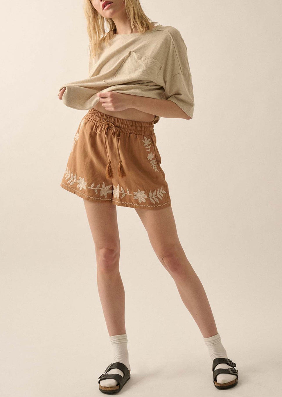 Bring effortless boho vibes to your summer wardrobe with the Boho Embroidered Shorts in warm cognac brown. Crafted from soft, breathable pure cotton, these casual shorts are as comfortable as they are stylish. White floral embroidery adds a chic, laid-back flair, while the tasseled drawstring elastic waistband gives a flexible, customizable fit that moves with you.