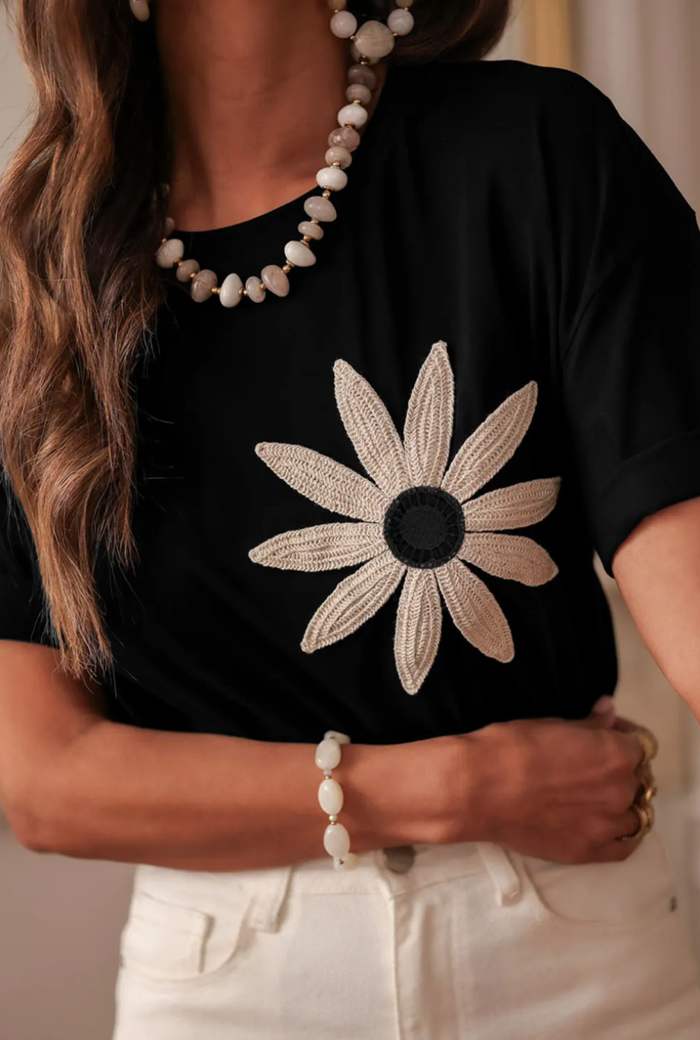 The Crochet Flower Cotton Tee: where cozy cotton meets carefree style – one stitch at a time.