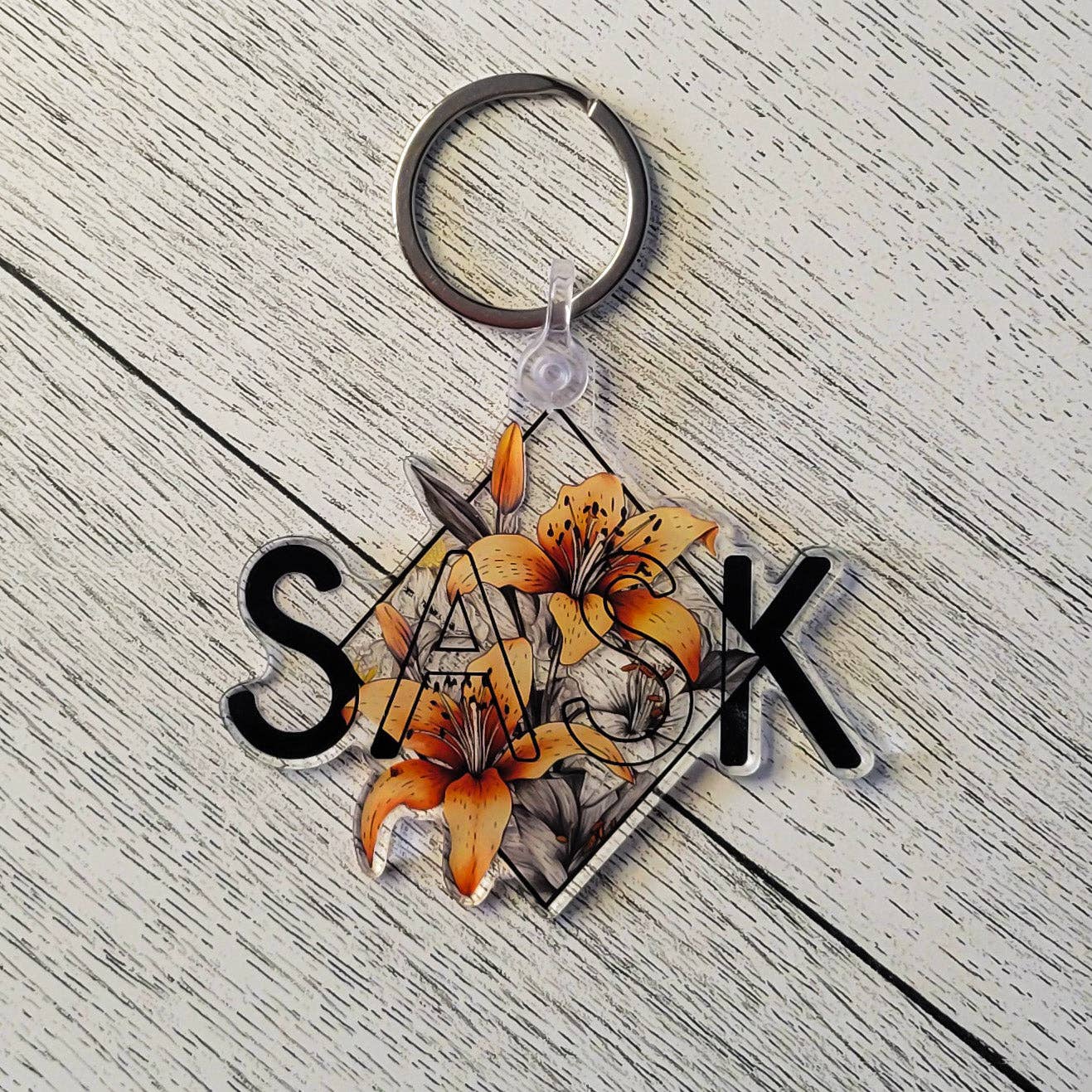 Add style to any set of keys with our SASK Diamond keychain! Featuring a diamond cluster of prairie lilies to represent Saskatchewan’s provincial flower, this acrylic keychain is lightweight, durable, and easy to carry around, clear snap closure and stainless steel key ring Step up your style game with our SASK Diamond keychain! Super lightweight and sturdily durable, these acrylic keychains are perfect for taking on the go. And with a clear snap closure and stainless steel key ring, you can easily add them to your keys. It's a fashionable accessory that's as practical as it is stylish!